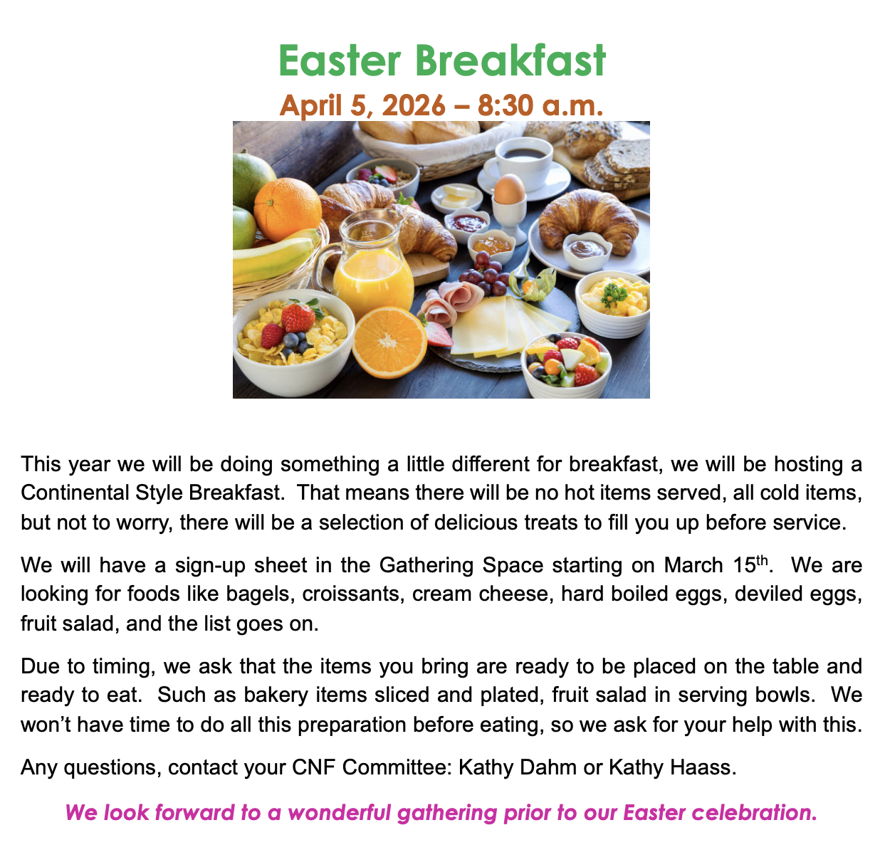 Easter Sunday is a special time of scripture, songs, and the message of Christ rising. At Trinity we celebrate Easter Sunday all morning first with a beautiful Sunrise service. We follow the Sunrise Service with our annual Easter Breakfast and following that is our traditional Easter Sunday Service.